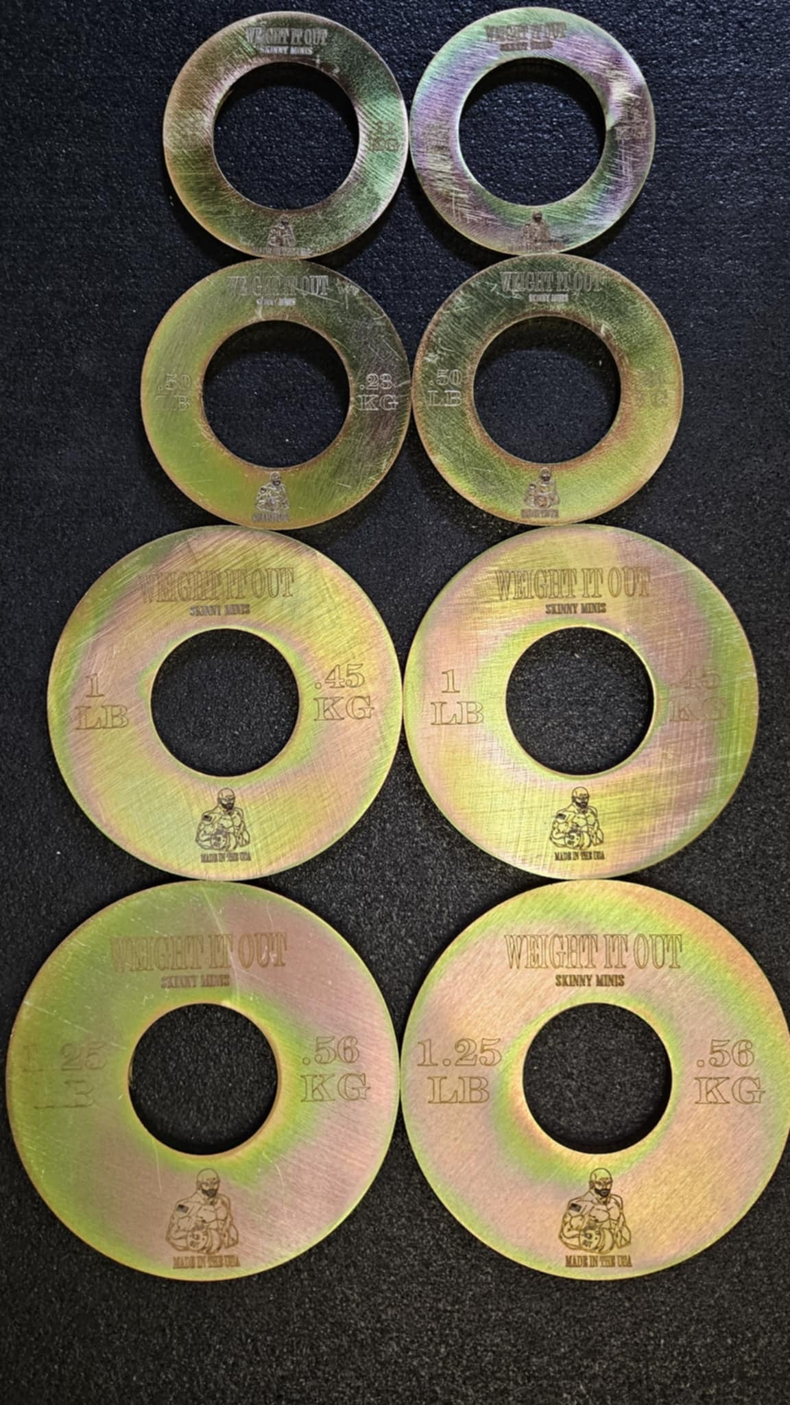 - 8-PIECE SET: Overcome lifting plateaus and reach a new personal best with Weight It Outās Set of 8 Plates. Set includes pair of 0.25lb, 0.50lb, 1lb, and 1.25lb plates, taking up minimal space on a bar sleeve to leave plenty of room for other plates and collars.